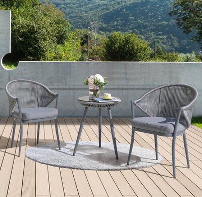 Плетеные стулья для террасы, веранды, летнего кафе, ресторана, гостиницы, отеля, патио, пиццерии, дачи. Каркас стула из алюминия серого цвета, веревочное плетение роуп серого цвета. Мягкие серые подушки в комплекте. Размеры: Ширина 57 см, Глубина 65 см, Высота 78 см. Стулья подходят для интерьера в стиле Бохо, Прованс, эко, средиземноморский стиль, морской стиль.