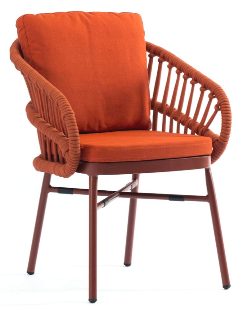 Садовые плетенные стулья из роупа для летней веранды, уличного кафе, ресторана, бара, отеля, патио, сада, дачи. Каркас металлический терракотового цвета, веревочное плетение роуп терракотового цвета. Мягкие терракотовые подушки в комплекте. Размеры: Ширина 61/43 см. Глубина 57/49 см, Высота 80 см, Высота сиденья 47 см, Высота до подлокотников 70 см, Вес 7,5 кг. Стулья подходят для интерьера в стиле эко, средиземноморский стиль.